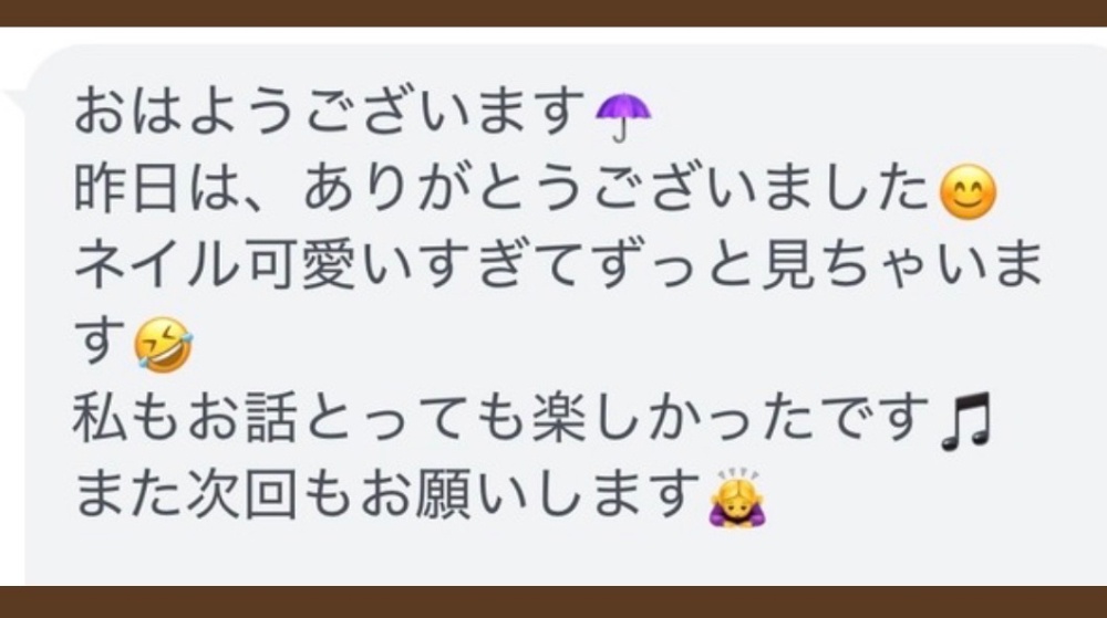 | Q.当日は何かしていった方がよいですか? | 何もしなくてOKです◎ むしろ当日はハンドクリームやネイルは塗らず ご来店いただく方がジェルネイルのもちにも影響しません。♪*お爪も切ったりせずそのままの長さでご来店いただいた方がお爪の形や長さをお好きな感じに整えさせていただけます🥰 |